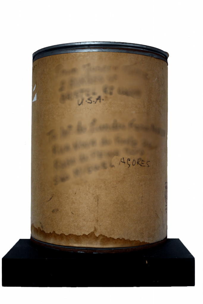 Notes: Barrel of circular shape built from thick cardboard and metallic rims on the ends. This kind of barrel was used by emigrants to send many varied things to their relatives that stayed in the islands. The barrel on display was sent by an emigrant family living in the United States.