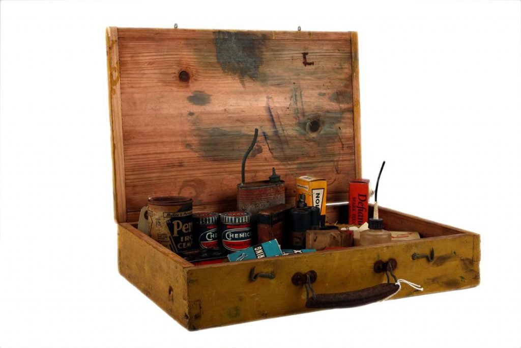 Notes: Box containing several objects (spark plugs, bearings, grease), used to repair engines and radio telephones.