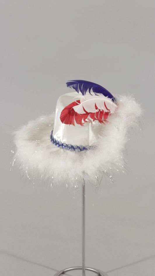 Materials: satin, lamé thread, straw, plastic, synthetic ermine, synthetic feathers and elastic